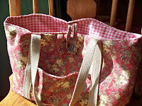 I had been looking for a fun spring project when I came across this tote tutorial on Homemade by Jill (a MUST VISIT blog). This simple design is very functional. As you can see, I've borrowed Jill's pattern and modified it a bit. Here are my first two attempts.
